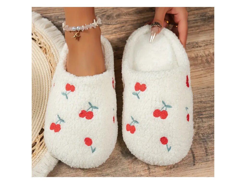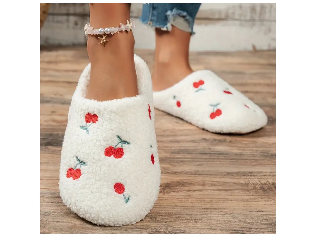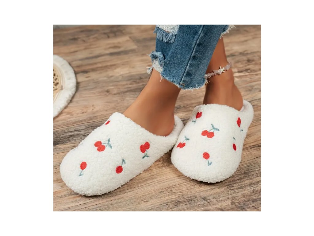 Dopraj svojim nohám mäkučké pohodlie s týmito rozkošnými nazúvacími papučami s čerešňovým vzorom. Biely plyšový povrch a výšivka červených čerešní dodajú tvojmu domácemu outfitu sladký nádych. Sú ideálne na prechodné obdobia – jar a jeseň – keď chceš teplo bez prehrievania.