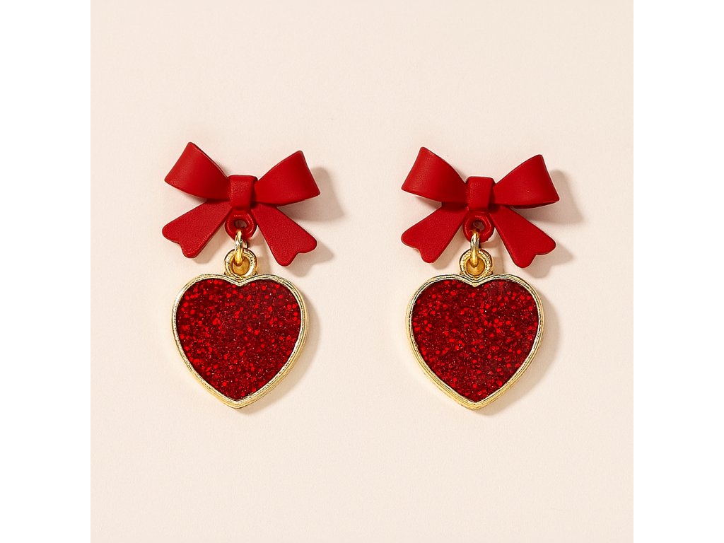 Náušnice s červeným srdcom a mašličkou – Romantický doplnok s trblietavým efektom ❤️🎀