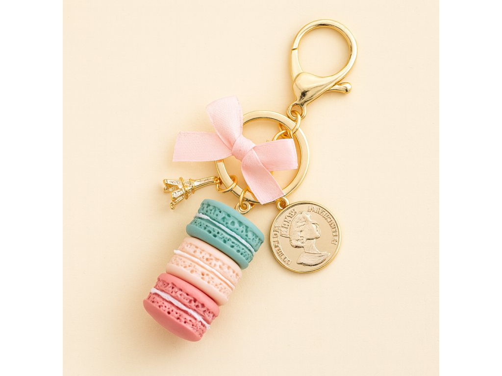 Tento pôvabný prívesok v sebe spája francúzsky šarm a hravosť: tri farebné makrónky zo silikónu, jemná ružová mašľa, Eiffelova veža a zlatá minca tvoria dokonalý módny doplnok pre tašky, batohy aj kľúče. Vďaka kovovej karabíne ho ľahko pripneš kamkoľvek. Perfektný darček, ktorý poteší každú romantickú dušu.