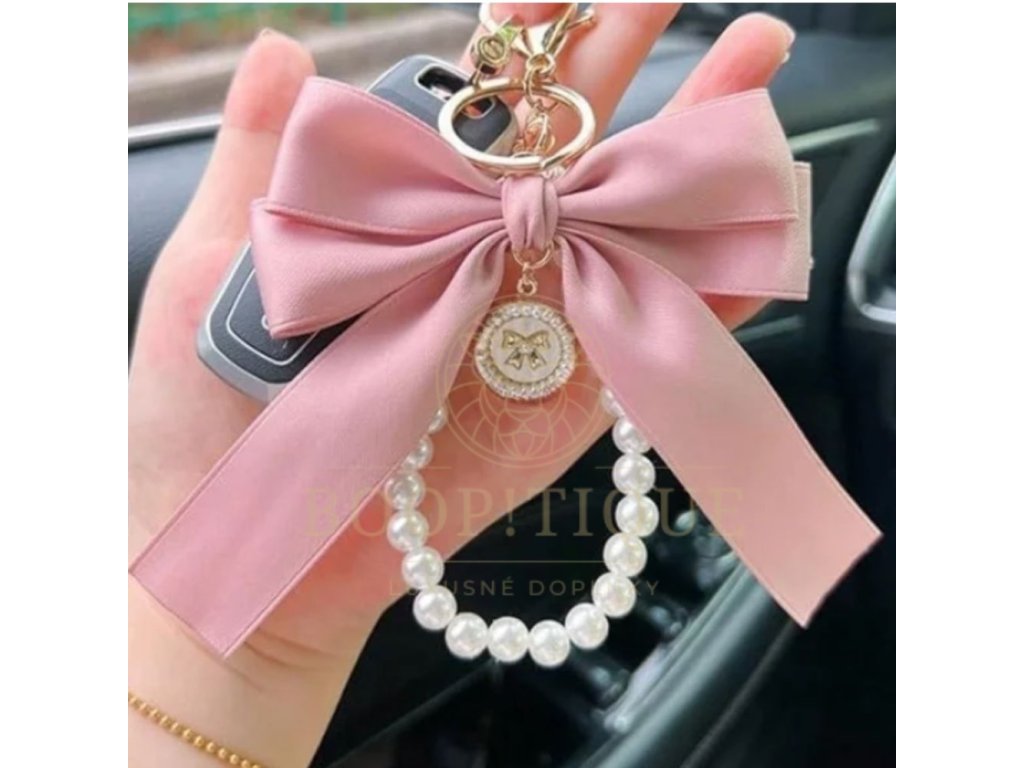 Luxusný prívesok s ružovou saténovou mašľou, zlatými kovovými detailmi a perlami prinesie eleganciu do vášho štýlu. Vyrobený z kvalitnej zliatiny, jemného saténu a doplnený trblietavými kryštálmi, pôsobí výnimočne a ženský. Skvelý ako ozdoba kabelky, batohu či ako štýlová kľúčenka. Ideálny darček pre každú ženu, ktorá miluje detaily a módne doplnky.