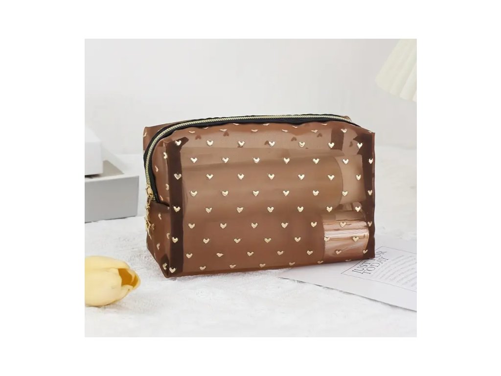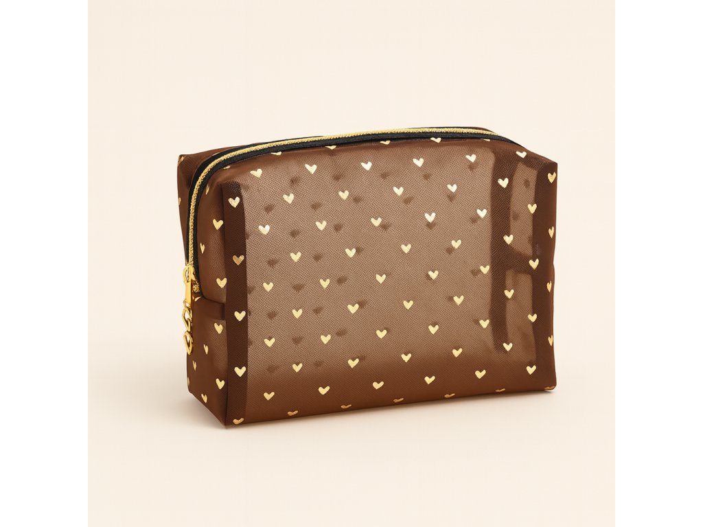Sieťovaná kozmetická taštička - Elegantná hnedá so zlatými srdiečkami